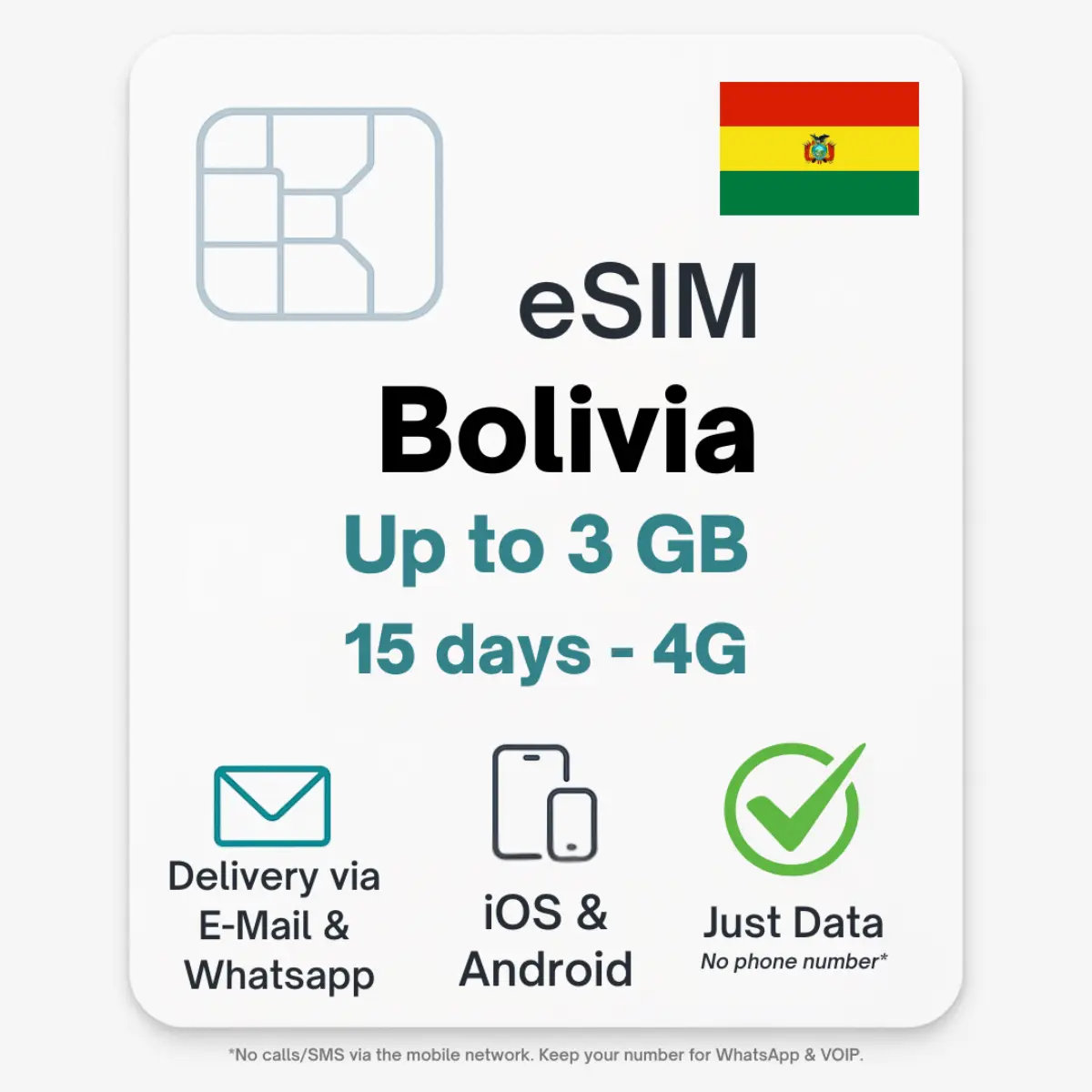 Get the highest speeds in Bolivia with this eSIM plan. Start your eSIM as soon as you arrive in South America and enjoy high-speed data with no hidden roaming charges.